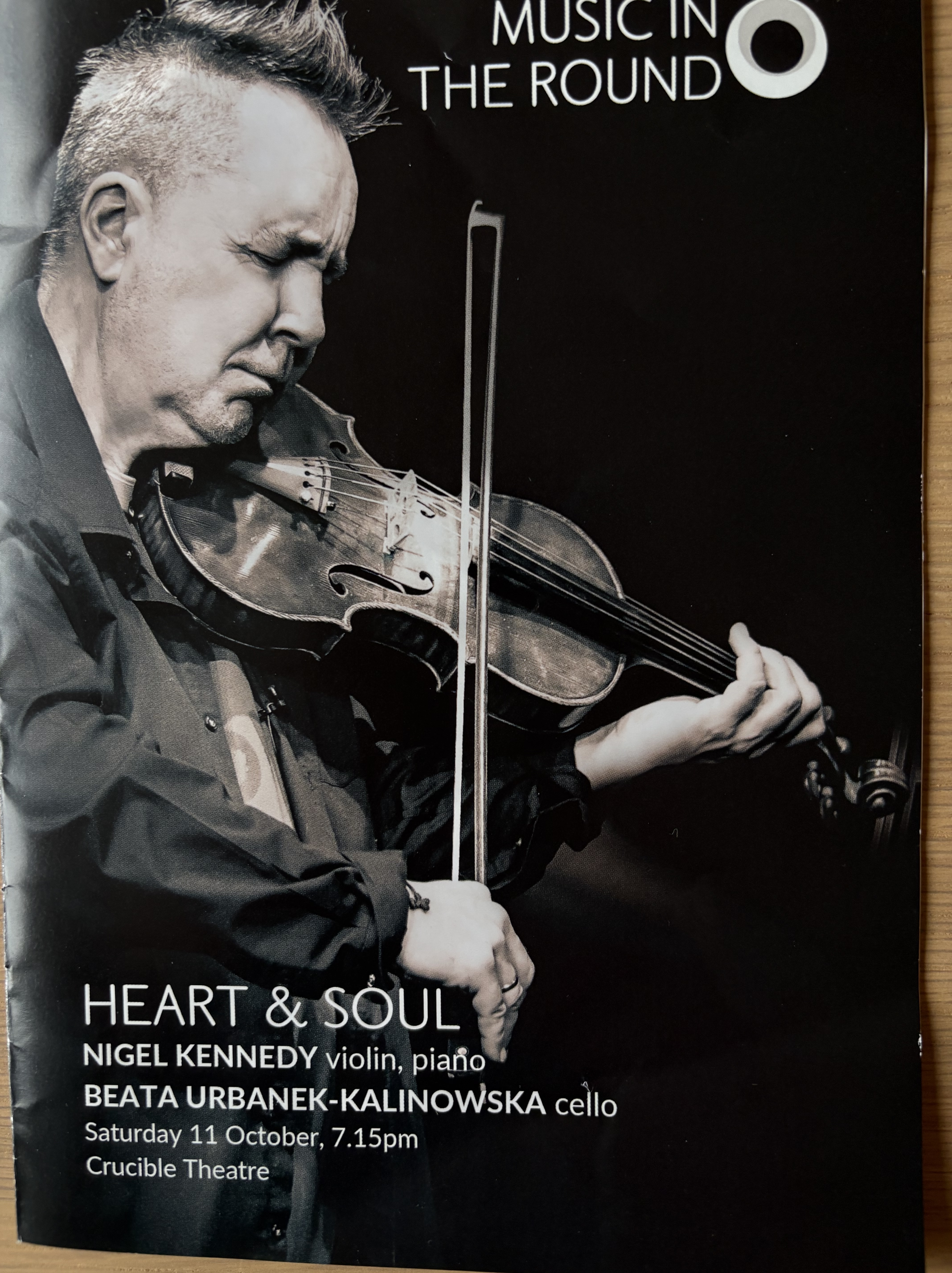 Nigel Kennedy: Heart & Soul, with Beata Urbanek-Kalinowksa (cello) – Kennedy, Komeda, Yellow Magic Orchestra Sakamoto, Bach (Crucible Theatre). Nigel is as always irrepressible and impossible to tie down, even to a set list. He borrowed a programme from someone on the front row and said ‘Oh no, it’ll be nothing like that’. In fact it was quite a bit like that, but some of the tracks on the programme never materialised, and others took their place, and there was another violinist on a couple of tracks whose name I never quite caught, a young woman who is clearly massively talented and who I’m sure we will hear of again.