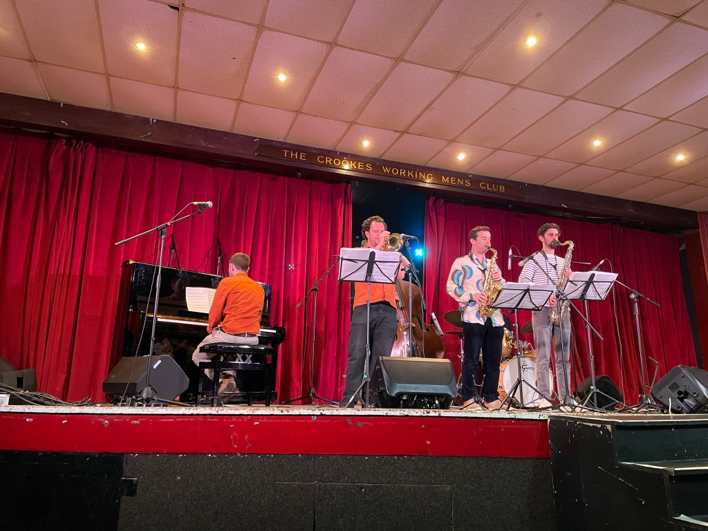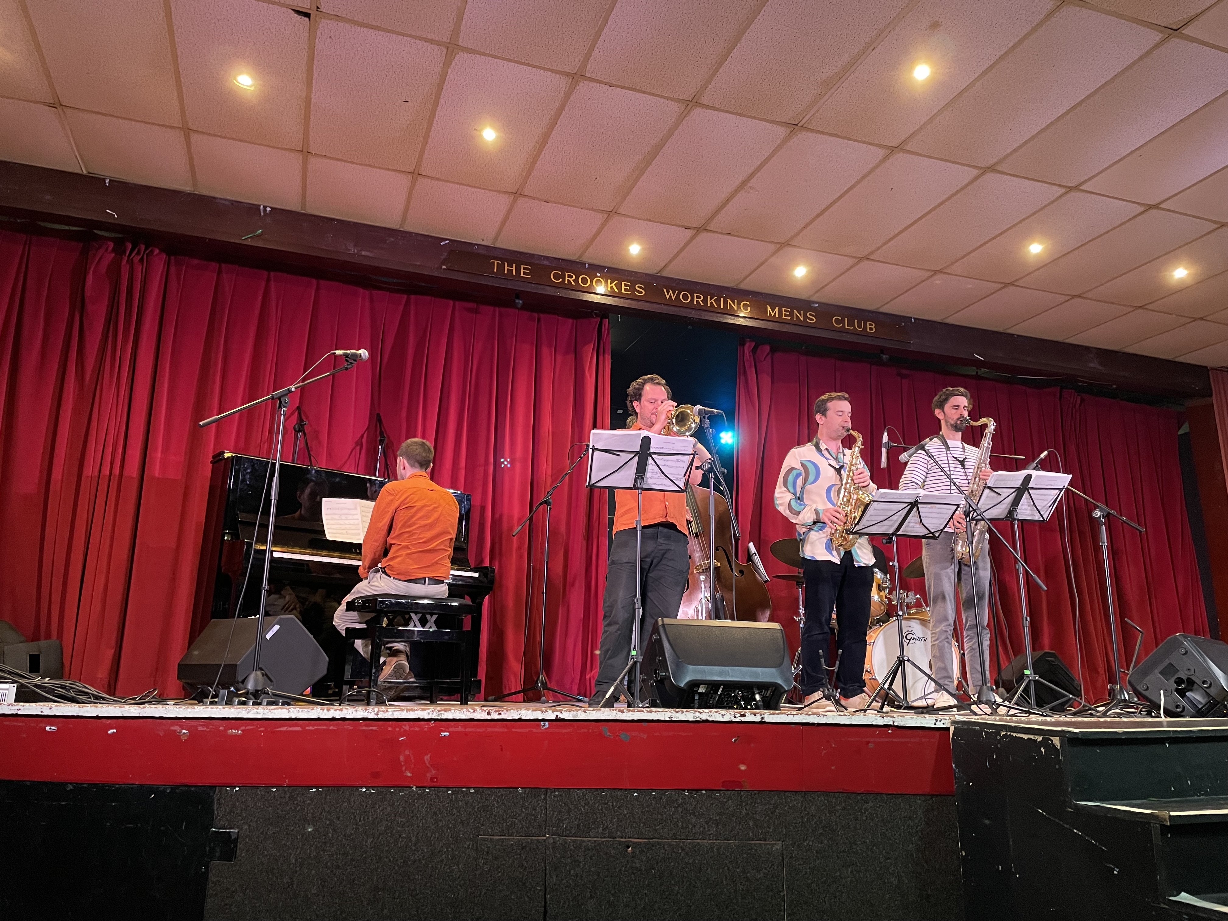 Misha Mullov-Abbado, Sheffield Jazz (Crookes Social Club). Lovely stuff – the music was from their new album Effra, very varied and beautifully played by Misha Mullov-Abbado on bass with James Davison: trumpet & flugelhorn, Tom Smith: alto sax, Sam Rapley: tenor sax, Liam Dunachie: piano and Scott Chapman: drums.