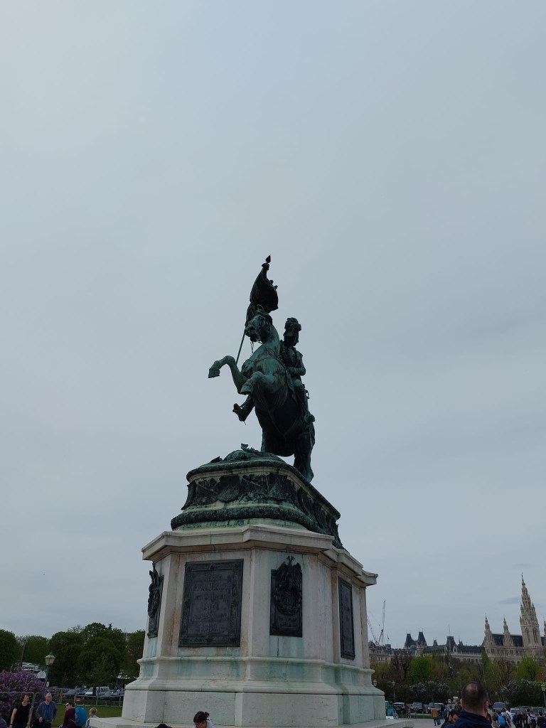 ‘The two over lifesize equestrian statues on high pedestals are what give it its name, two great military commanders on rearing horses with flowing manes and tails in the Baroque style, one carrying Prince Eugene of Savoy and the other the Archduke Charles, brother of the first Emperor Francis who, in one victorious battle, had stemmed for a while Napoleon’s advance on Vienna. … And yet, with all their panache, there is so little boastfulness in this square. What first meets the eye and impresses the mind are the broad avenues of chestnut trees lining it on three sides … They give the square its peaceful, almost countrified look; they are conducive to slow perambulation and quiet contemplation.’ (Elisabeth de Waal – The Exiles Return, p. 227)