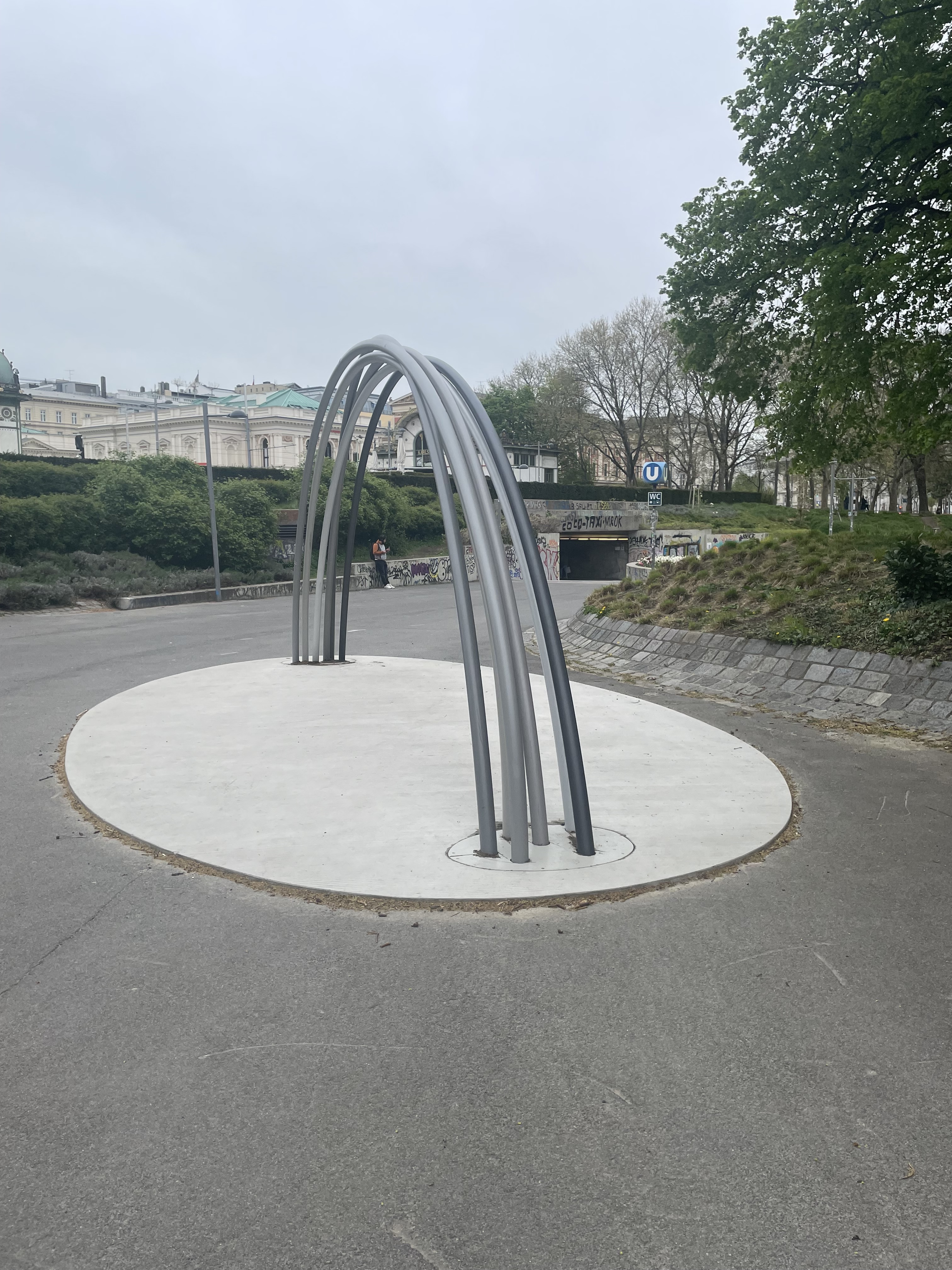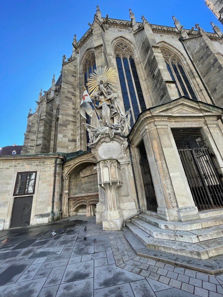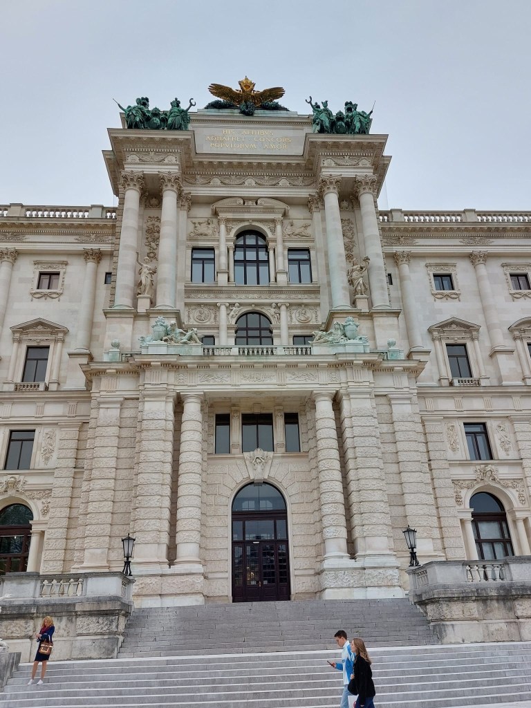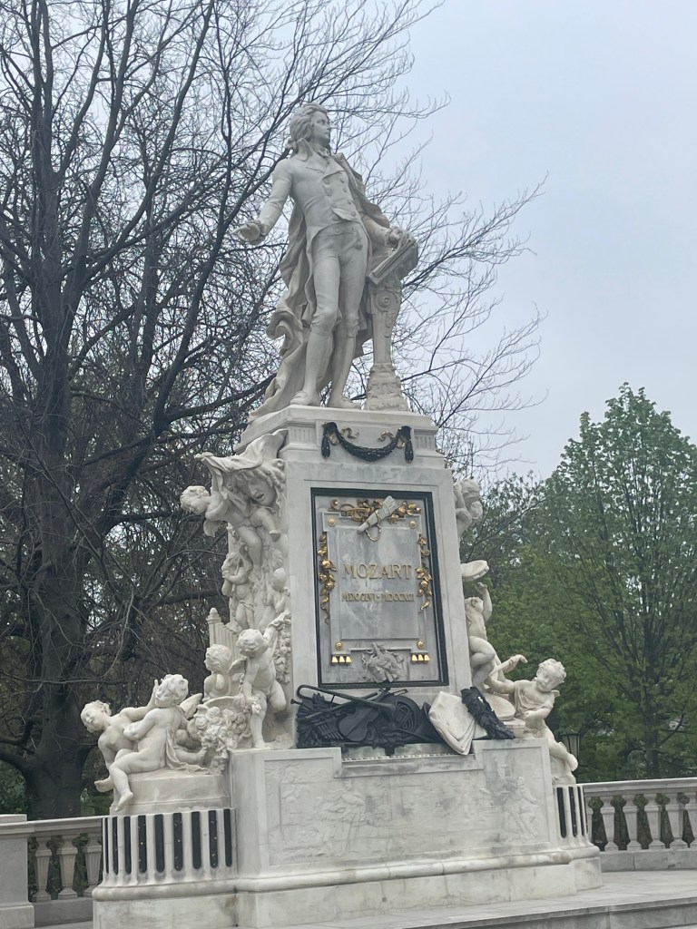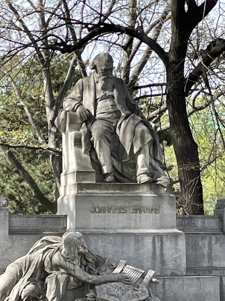 We saw the Rathaus – Vienna City Hall – and walked through the Burggarten where we found a statue of Mozart. Then the Resselpark (Karlsplatz), where we saw Sarah Ortmeyer and Karl Kolbitz’s 2023 memorial for homosexuals persecuted by the Nazis: ‘Arcus – Shadow of a Rainbow’, the colours of the rainbow changed to grey, combining grief and hope. There’s also a Brahms statue here, which I like very much.