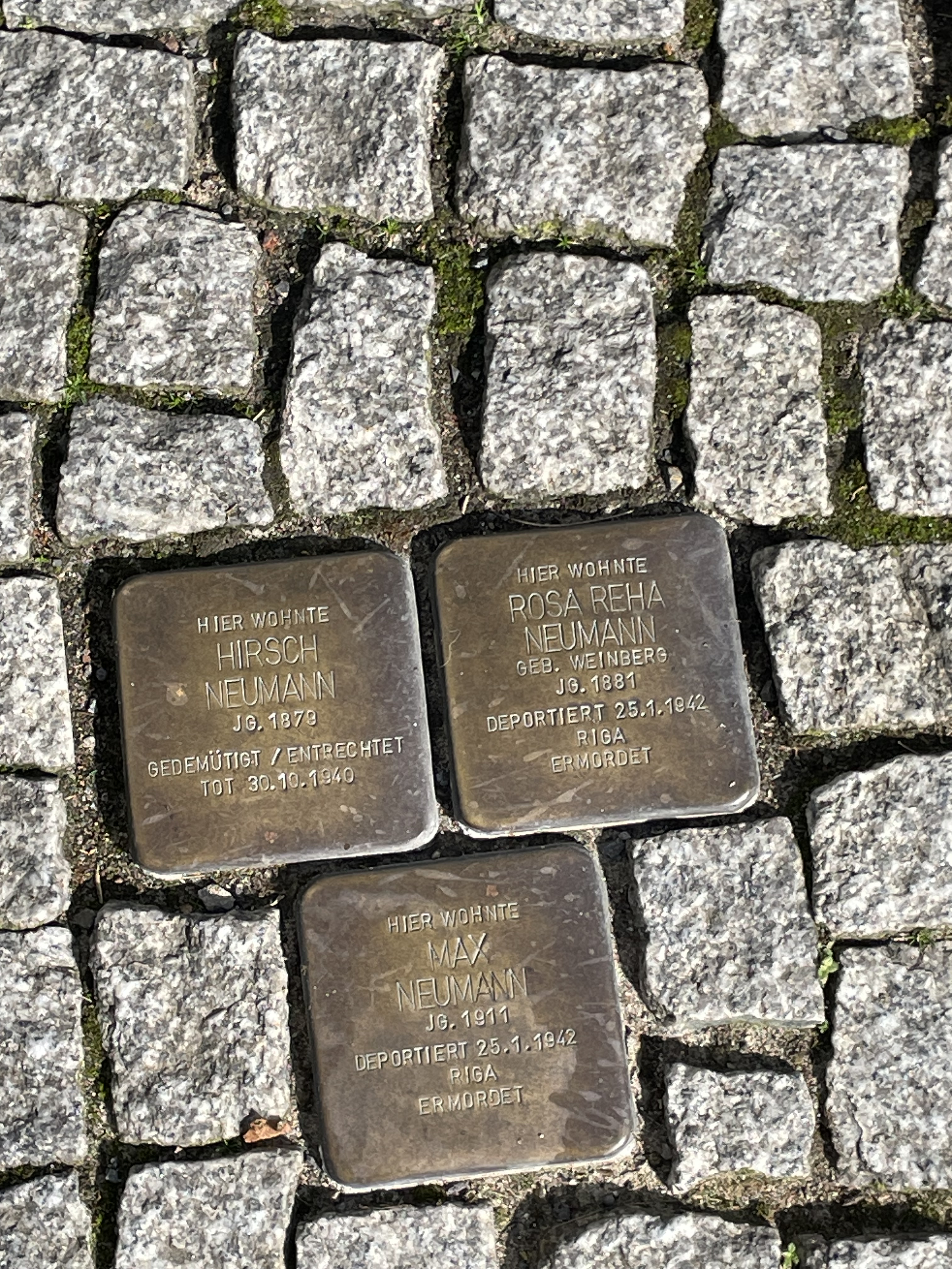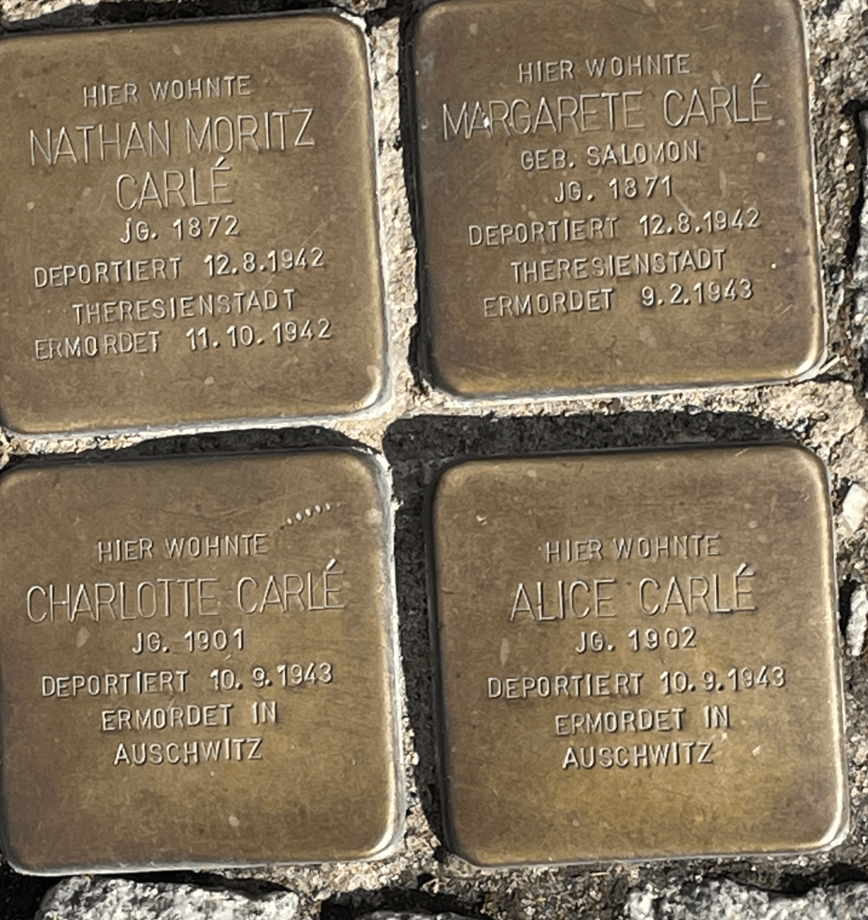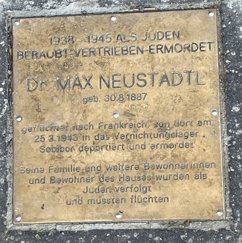Stolpersteine: Paula Wilhelm (née. Mandl), born 6 April 1887, deported 29 April 44 to Auschwitz; and Dr Max Neustadtl who fled to France but was deported on 25.3.43 to the Sobibor extermination camp and murdered.