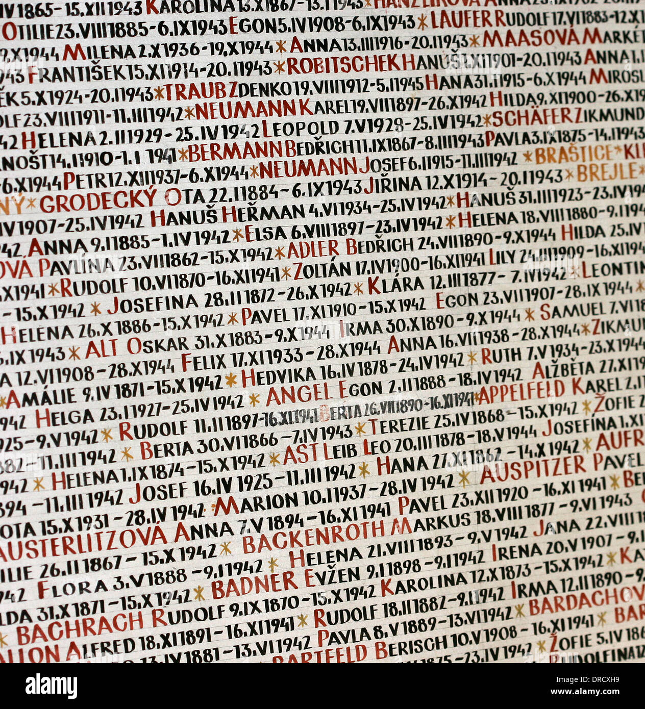 ‘The storm is within, a blizzard that stings the eyes and batters on the mind. Not snow or sleet but names. Names everywhere, names on the walls, names on the arches and the alcoves, ranks of names like figures drawn up on some featureless Appellplatz. Names and dates: given names and dates in black, surnames in blood. Dates of birth and dates of death. Seventy-seven thousand seven hundred and ninety-seven of them, names so crowded that they appear to merge one into the other and become just one name, which is the name of an entire people – all the Jews of Bohemia and Moravia who died in the camps.’ (Simon Mawer – Prague Spring, pp. 218-19)
