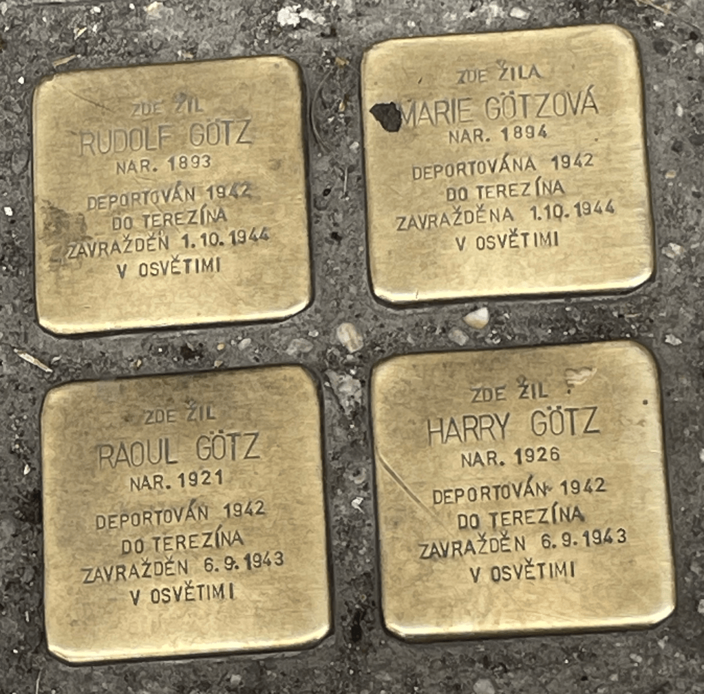 Stolpersteine (Nové Město): four members of the Gotz family. Rudolf was 49, and his wife Marie 48 when they were deported from Prague to Theresienstadt; two years later both were transported to Auschwitz where they were murdered. Their sons Raoul and Harry made the same journeys at slightly different times than their parents. They were 21 and 16 respectively when they were deported, four months before their parents, to Theresienstadt, and then in September 1943, a year before their parents, to Auschwitz.