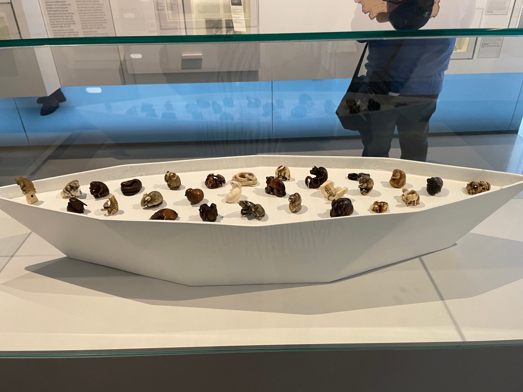 One fascinating display here is part of the collection of netsuke whose story is told in Edmund de Waal’s The Hare with the Amber Eyes. These are the Japanese miniature sculptures which belonged to the Ephrussi family, and which were kept out of the hands of the Nazis, unlike most of the contents of the Palais Ephrussi. Six weeks after the Anschluss, the family servant, Anna, was required to pack away the belongings of her former employers. There were lists, of course, to ensure that everything was accounted for. But each time that Anna was in the Baroness’s dressing room, she slipped a few of the netsuke into her apron pocket, and hid them in her room. In December 1945, Anna gave Elisabeth de Waal 264 Japanese netsuke.