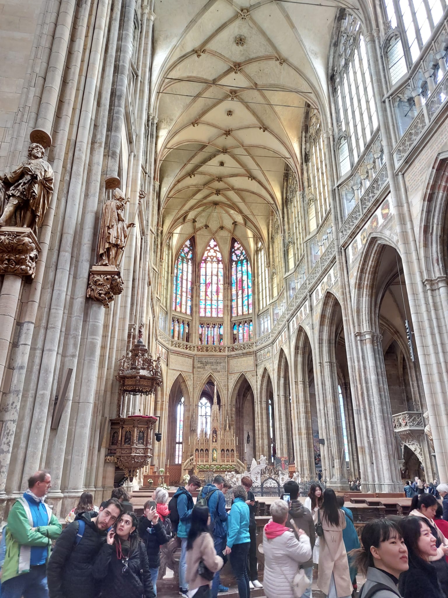 St Vitus Cathedral – this took nearly 600 years to complete, 1344-1929. One of the final stages involved the installation of the beautiful stained glass. Czech art nouveau painter Alfons Mucha decorated the windows in the north part of the nave, František Kysela the rose window. Even though half of the cathedral is a neo-Gothic addition, much of the 15th century design was incorporated in the restoration.